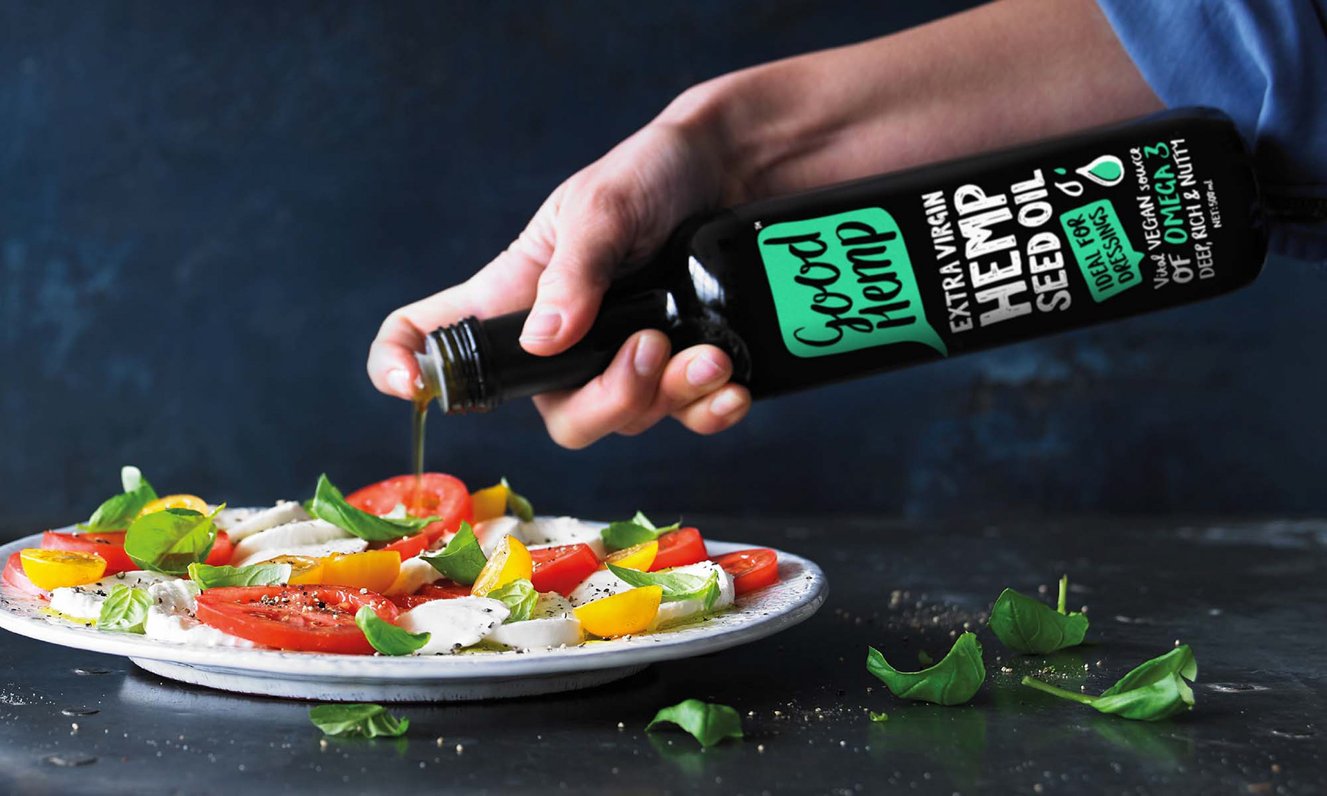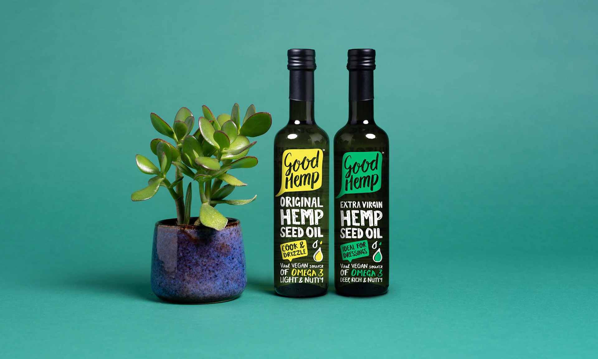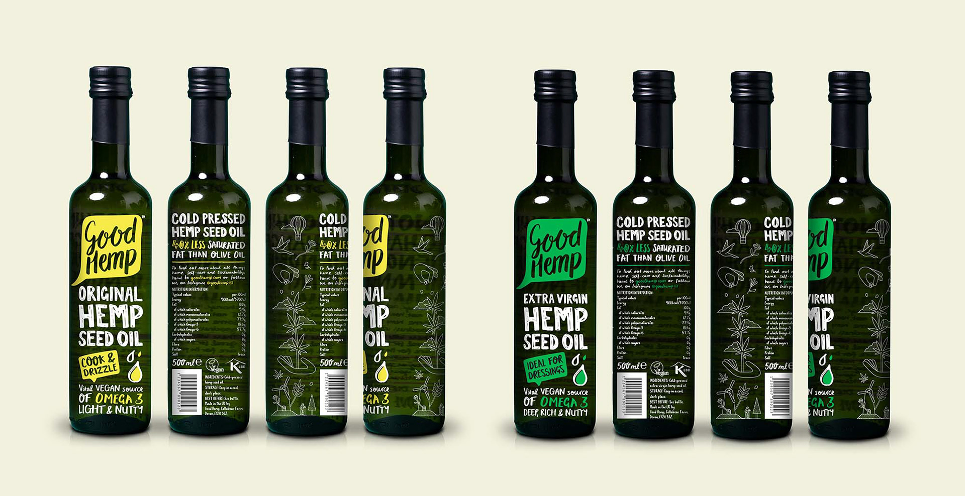 Packaging design for Good Hemp's Original Hemp Seed Oil and Extra Virgin Hemp Seed Oil.